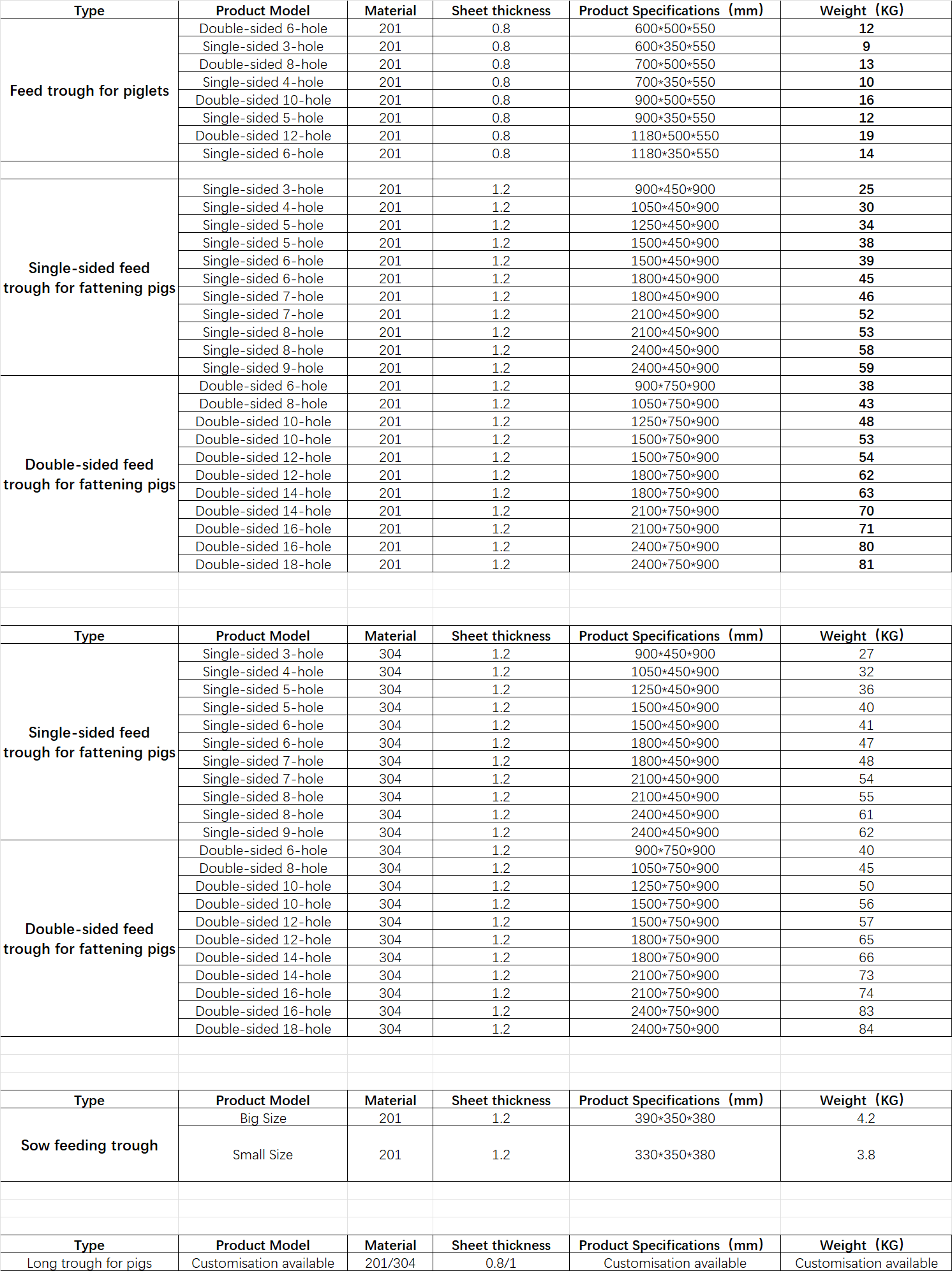 The primary material is stainless steel, categorised into nursery pig feeders, finishing pig feeders, and sow feeders. Constructed from 201 or 304 stainless steel, precision cutting minimises dimensional variations. Designed for easy cleaning to reduce bacterial growth. Available in multiple sizes, with bespoke options to meet specific requirements.