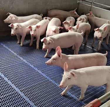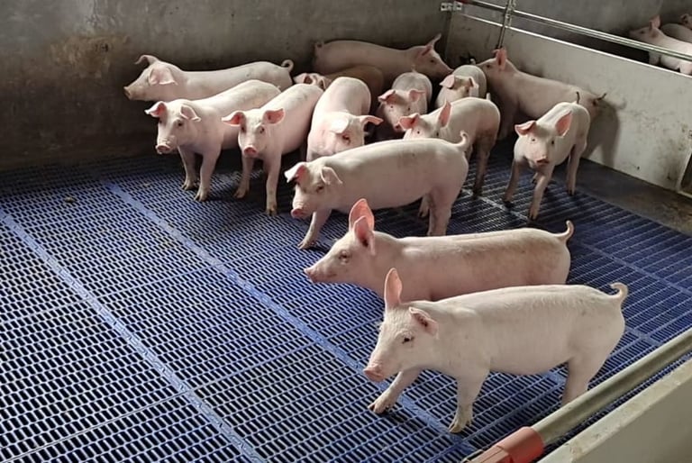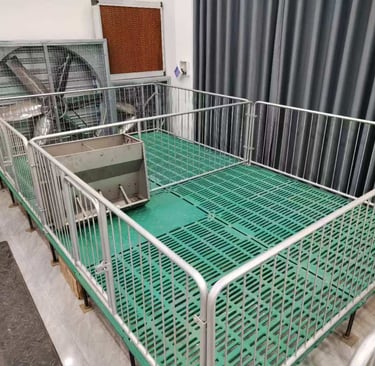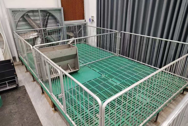 The open pen layout allows free movement and social interaction, helping reduce stress and support animal welfare. Slatted floors provide efficient manure drainage, improve hygiene, and reduce daily labour requirements. The system can be flexibly configured with feeders, drinkers, heating lamps, and ventilation equipment.